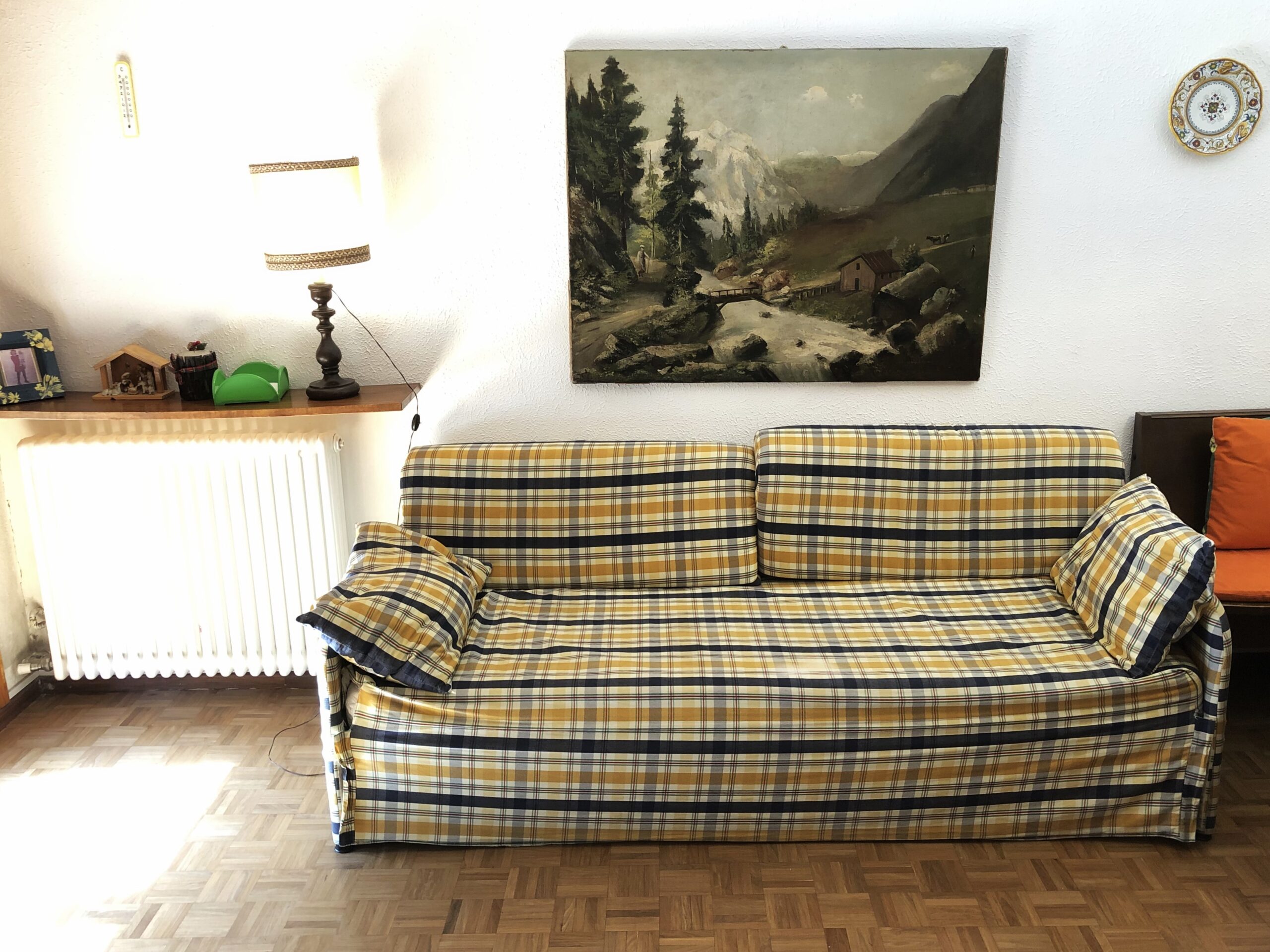 in soggiorno: armadio a muro, divano letto a due posti e televisore.